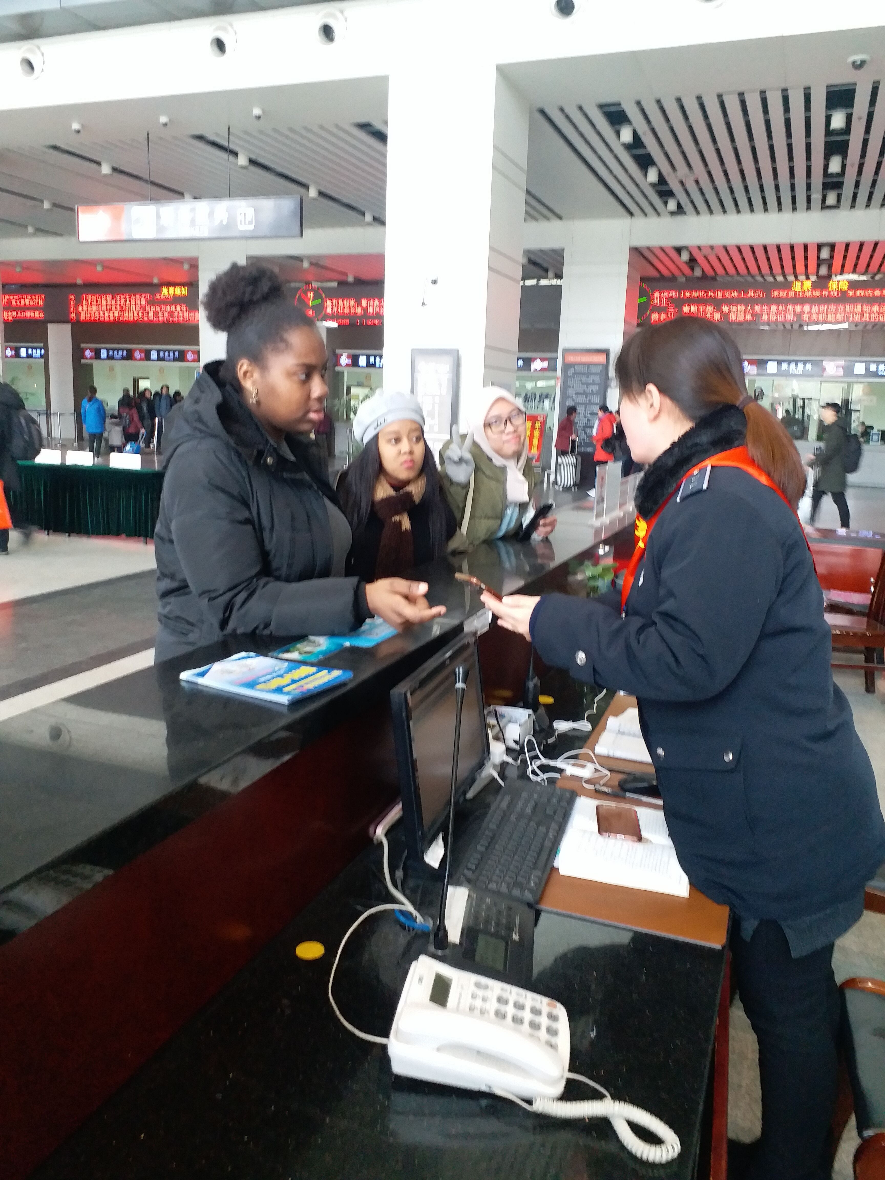 下午12時(shí)30分左右,來自揚(yáng)大的南非和印尼的三位女留學(xué)生,來到車站,想乘車去南通與同鄉(xiāng)會(huì)面,到了車站后,才發(fā)現(xiàn)去南通需要到揚(yáng)州汽車東站乘車,而且班次的時(shí)間在兩點(diǎn),一時(shí)性急的三位留學(xué)生沒了主意,操著生硬的中文,來到服務(wù)臺(tái)求助。服務(wù)臺(tái)工作人員尹海霞熱情地幫助她們查詢了發(fā)往南通的大巴班次,立即為她們購(gòu)買了已經(jīng)為數(shù)不多的車票?紤]到時(shí)間比較緊,尹海霞又將她們帶到公交上客區(qū),送她們上車,趕往東站。印尼的留學(xué)生上車時(shí)豎著大拇指說道:“車站漂亮,人更漂亮!”