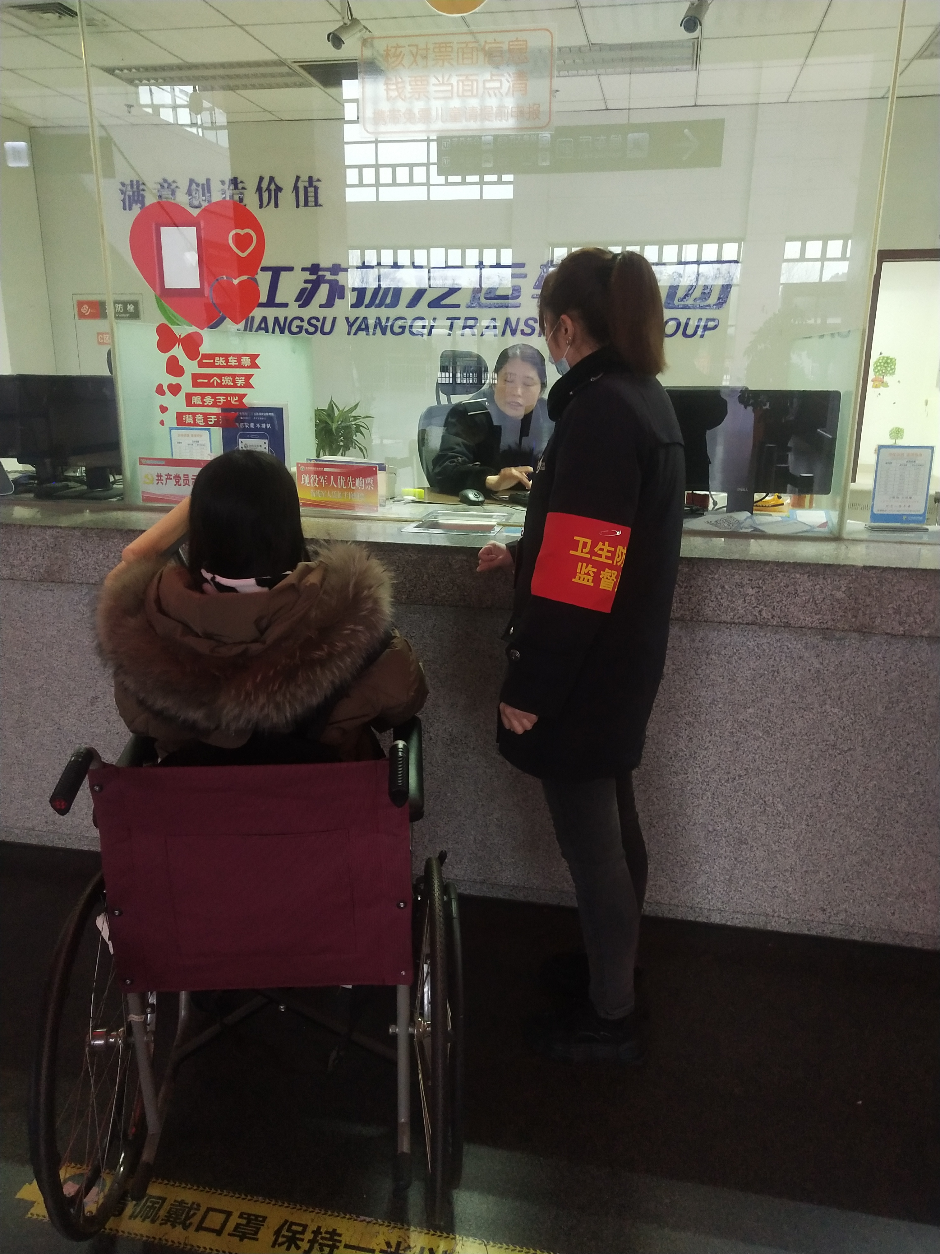 周俊云班長讓她稍等會,就幫她推來了車站里提供的輪椅,讓她坐在輪椅上面推她去售票窗口買票,還很熱心的一直送到重點旅客無障礙直升電梯里面,然后再送到二樓檢票口,直到幫助這位旅客上了車,臨走前還對旅客說一句一路順風。